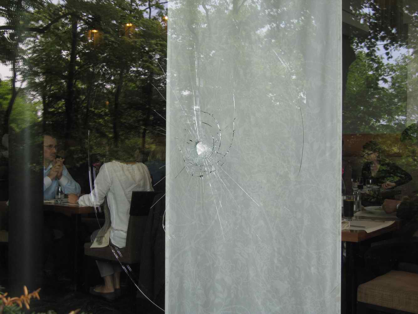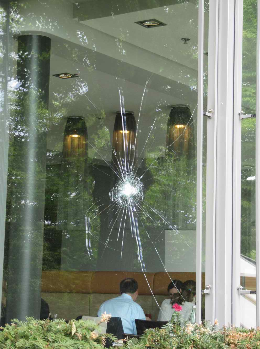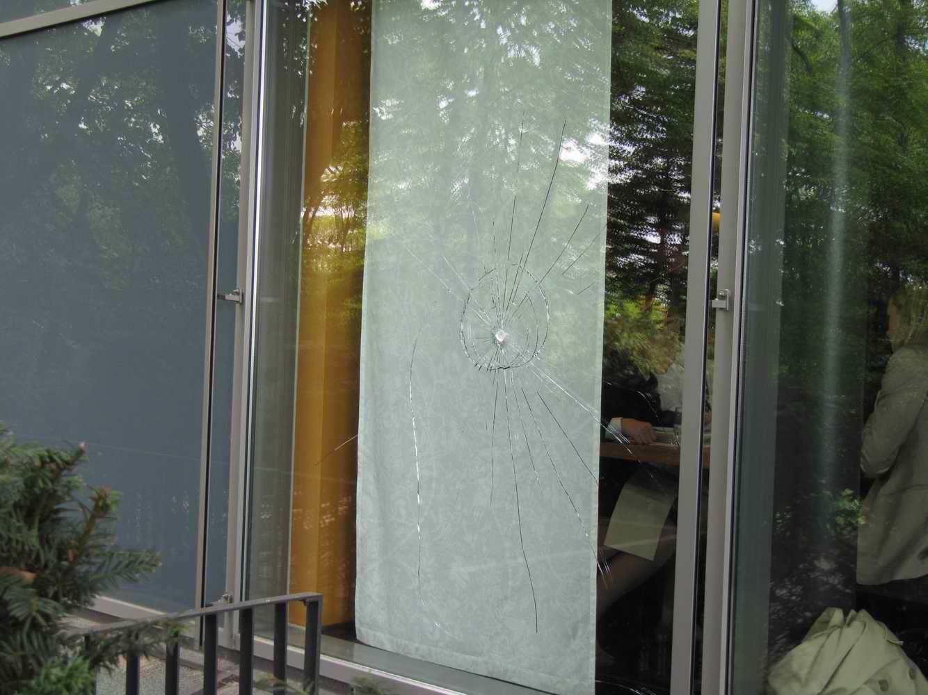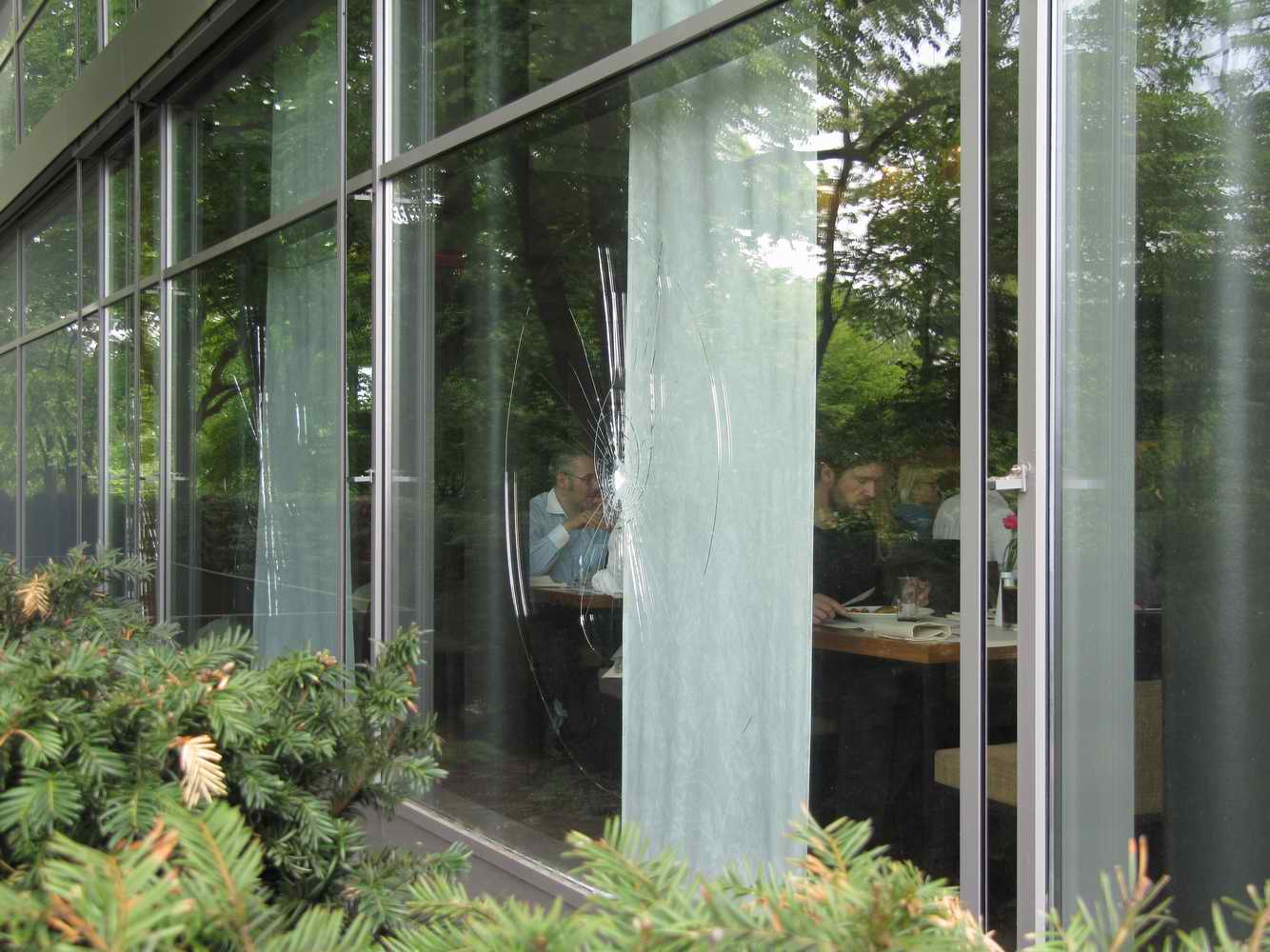 Wie deutlich zu sehen ist, haben am Glasrestaurant des Mövenpick-Hotels 4 Panzerglasscheiben Totalschaden erlitten. Wie aus zuverlässiger Quelle zu hören ist, haben offenbar in der Nacht von Dienstag auf Mittwoch (17./18. Mai 2011) Gegner_innen des Hotels zugeschlagen. Das Hotel ist seit Beginn der Planungen wegen der Beschneidung öffentlicher Raüme und Zuspitzung der Gentrifizierung ein Dorn im Auge vieler Anwohner_innen.